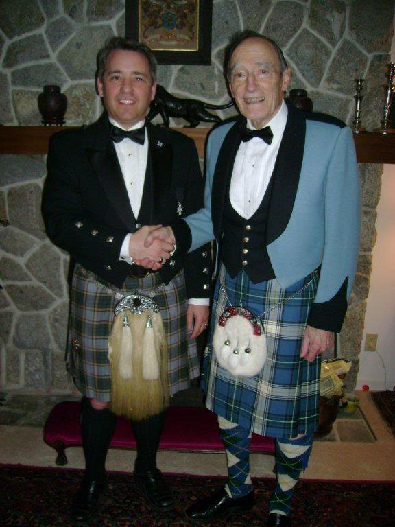 Macdowall feudal territories in adjacent Galloway. They are welcome members of Clan MacDowall as advocated by the famed Scottish heraldic genealogist Hugh Peskett. Pictured below in his Kyle tartan is Jaeame Koyil, the founding President of the Kyle Family Society which represents the ancient Kingdom of the Strathclyde Britons, and Chief Fergus Macdowall in two of the tartans his clansmen may wear.By Scott MacDougald and Jaeame Koyil and